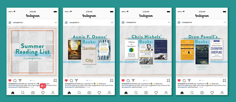 Client: Cross Point Church Instagram post series designs for Cross Point Church highlighting the pastor’s book picks to add to the viewer’s reading list for the summer.